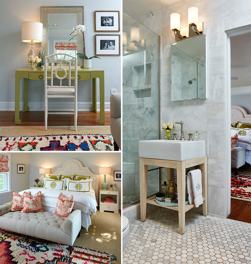 • Neutral walls, furniture and floors pair effortlessly with splashes of color in the master bedroom; cheerful coral, lime and robin’s egg blue accent brightly without making the room overly busy. Pillows and Roman shades are custom; bedding is from Leontine Linens in New Orleans. Lamps, side tables, dressing table and chair are all Bungalow Five, from Bebe’s.