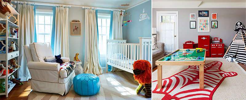 • A leftover from the room’s days as a grown up TV-watching retreat, the playroom’s comfy couch gives Mom and Dad an adult-sized place to relax during play time. The fun Jonathan Adler rug under the play table picks up the bright hue of the kitchen set, and the black-and-white striped teepee (LittleMeTeepee) has a fun complement in the pirate hat.