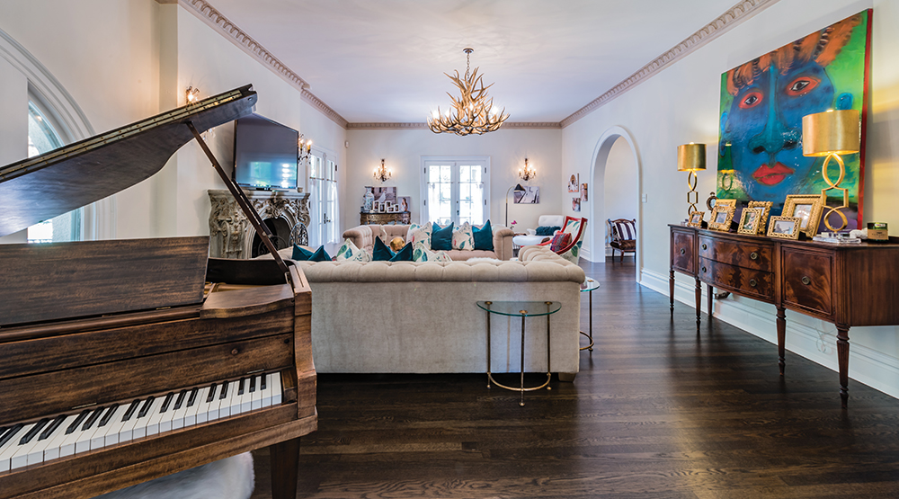 During a tour of the home, Susan talks lovingly of its permanent details and the careful thought they gave in decorating it. Their decor and furniture feature a mix of antiques and contemporary pieces, and include lots of color. Many of the house’s original features – including the wrought-iron front door, the floors, the ornate plaster details on ceilings and fireplace and more – have been preserved.
