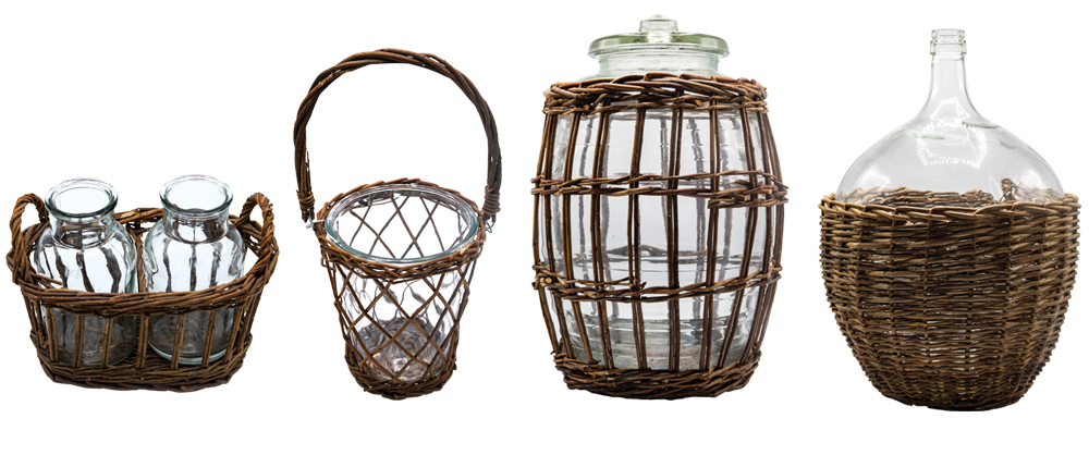 From The Flower Shop Wicker carafe holder, $20; Wicker basket with glass vase, $20; From Live Boho Glass vase in wicker basket, $80; Glass jar in wicker frame, $64