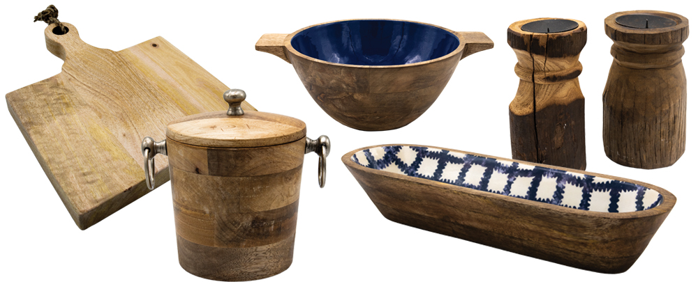 From Emory Anne Deli cutting board, $34; Wooden bar bucket, $80; Blue enamel and wood bowl, $48; Bungalow enamel cracker dish, $44; From Live Boho Wooden pillar candle holders, $16