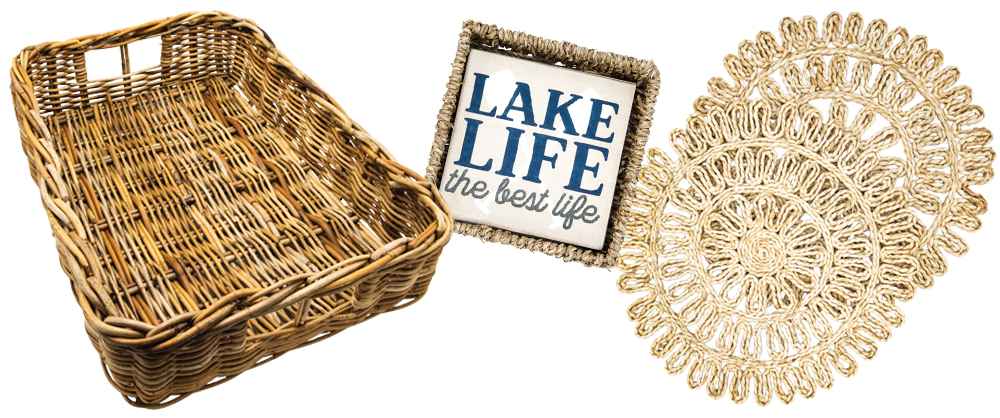 From Emory Anne Country storage basket, $95; Lake napkins in basket, $12; From Tulips Straw circle placemats, $10