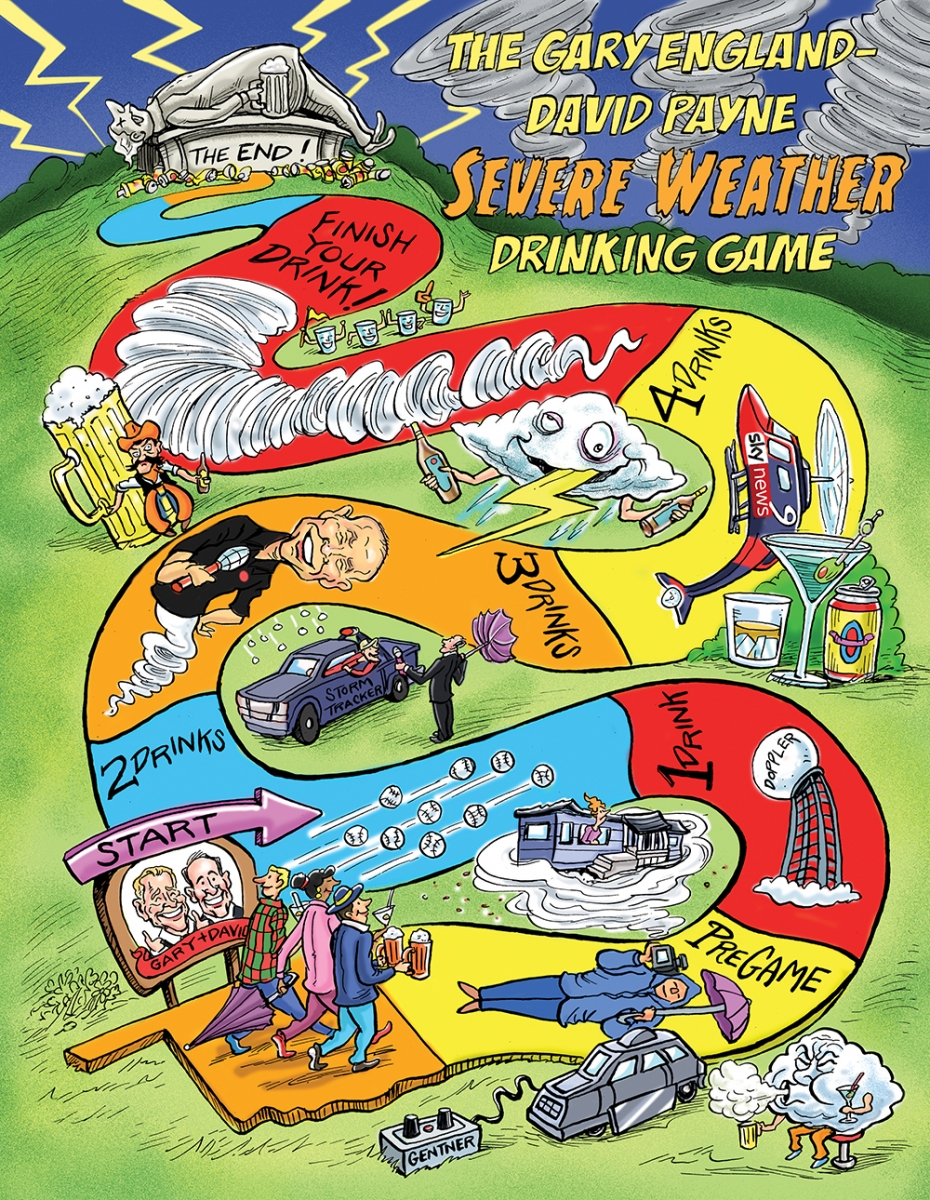 Everyone selects a county other than Pottawatomie County. Every time David mentions your county, you take one drink. Take two drinks every time we see footage from your county. Take four drinks if a tornado touches down in your county.