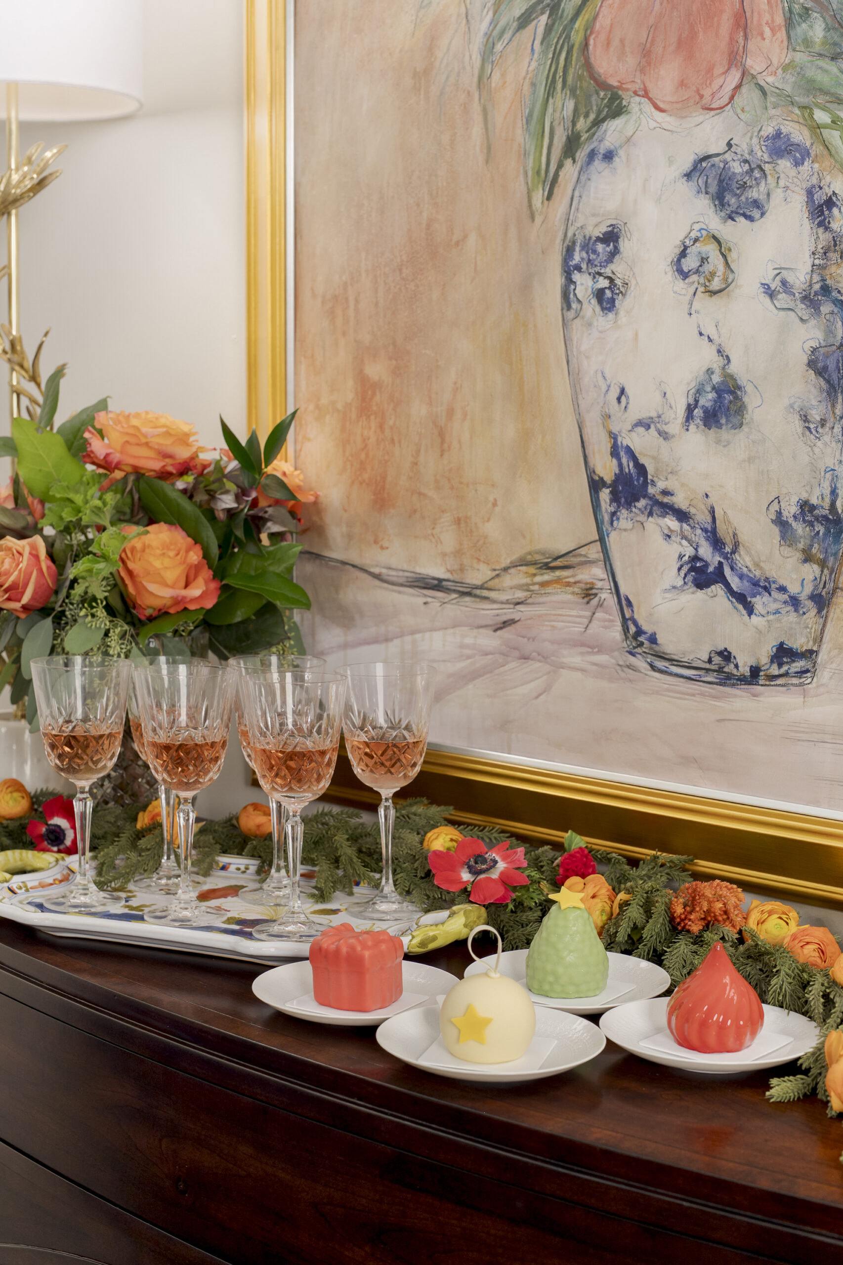 This wintertime table layers seasonal delights to prompt meaningful conversations and provide for a memorable evening. To create such an inviting scene, Keven Calonkey Carl and Cassidy Brunsteter of Mister Robert Fine Furniture and Design combined family heirlooms and personal collections with classic and modern design touches. Bountiful florals from The Flower Truck and gourmet desserts by L’Arc Patisserie complete the party.
