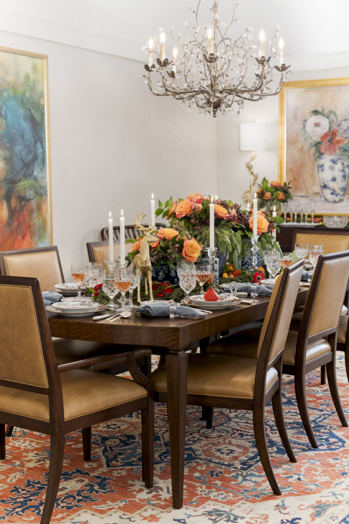 Collectible crystal stemware and silver pieces sit beside soft blue napkins in crystal rings. Various blues repeat on the ginger jars. Orange colors appear throughout the surrounding artwork, all paintings by Kelly O’Neal from Dallas. The tables and chairs are in a classic walnut finish but with clean lines and streamlined legs. All together, it becomes an eclectic yet harmonious display.