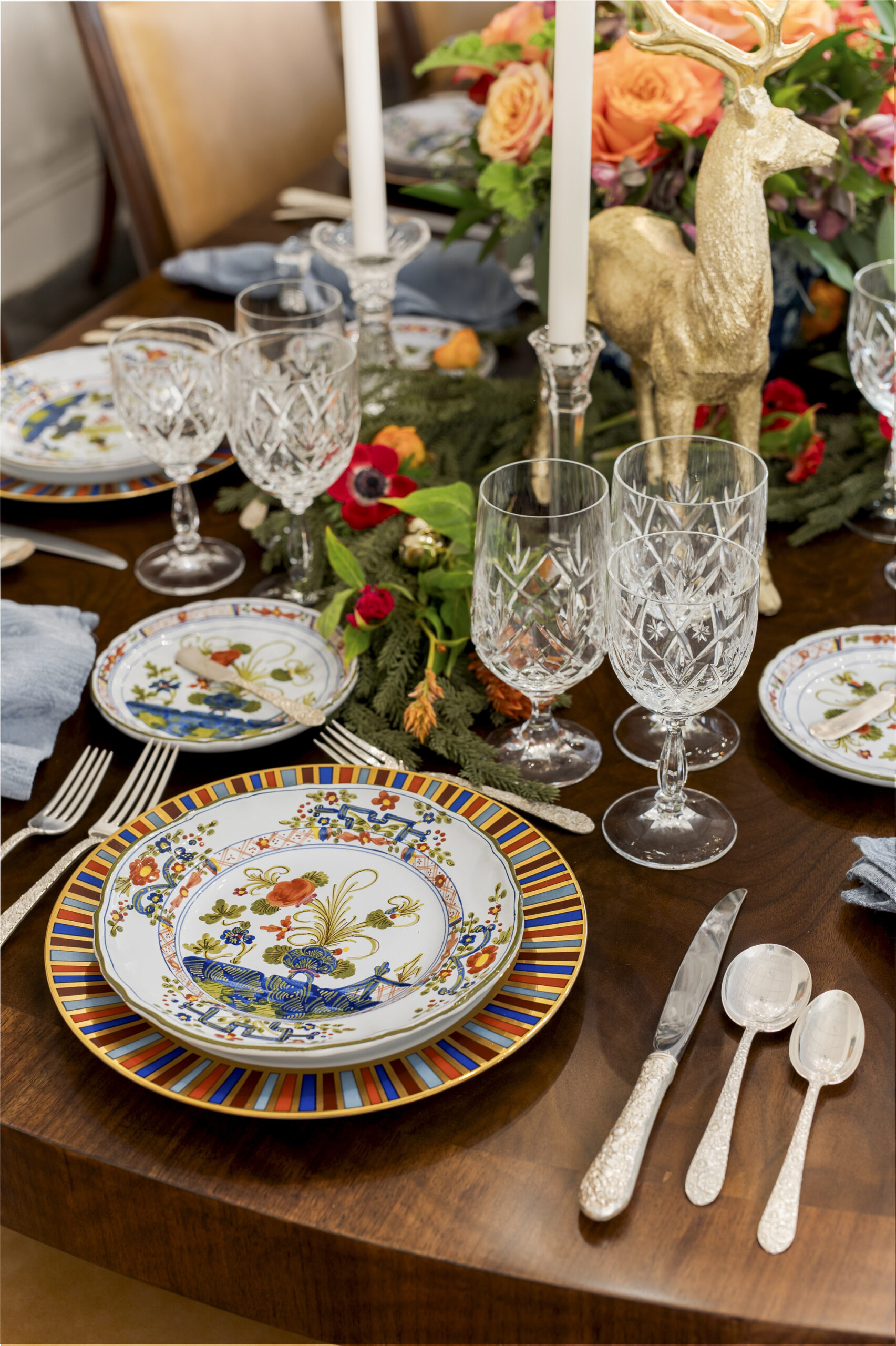 The stunning centerpiece comprises crystal candlesticks in various heights and two golden reindeer nestled among abundant flowers and garland. Blue-and-white ginger jars overflow with arrangements by The Flower Truck. Shades of green, orange and purple are carried by free spirit roses, terra cotta roses, anemone, ranunculus, seeded eucalyptus and helleborus. Playful stems are also carefully plucked and placed throughout the evergreen garland, extending the flowers’ intriguing textures and colors down the table for all to admire.